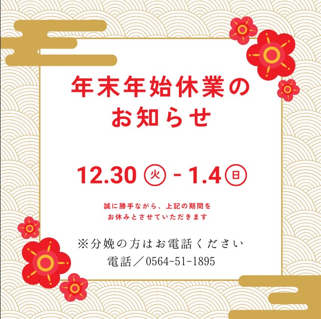 上記の期間を年末年始の休業とします。分娩予約された方は、お電話にて対応いたします。まずはお電話ください。