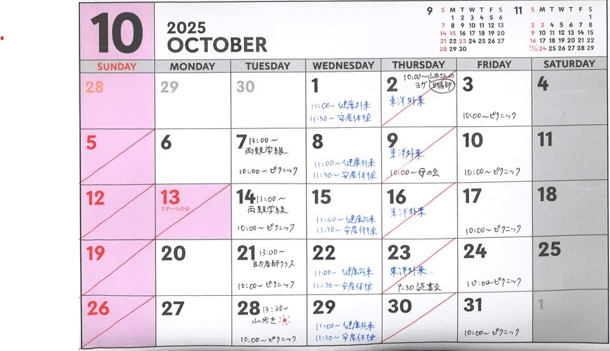 日中は涼しい時間帯も増えてきました。火曜、金曜日のピクニックを再開します。予約は不要ですので、10時に医院前に集合ください。
